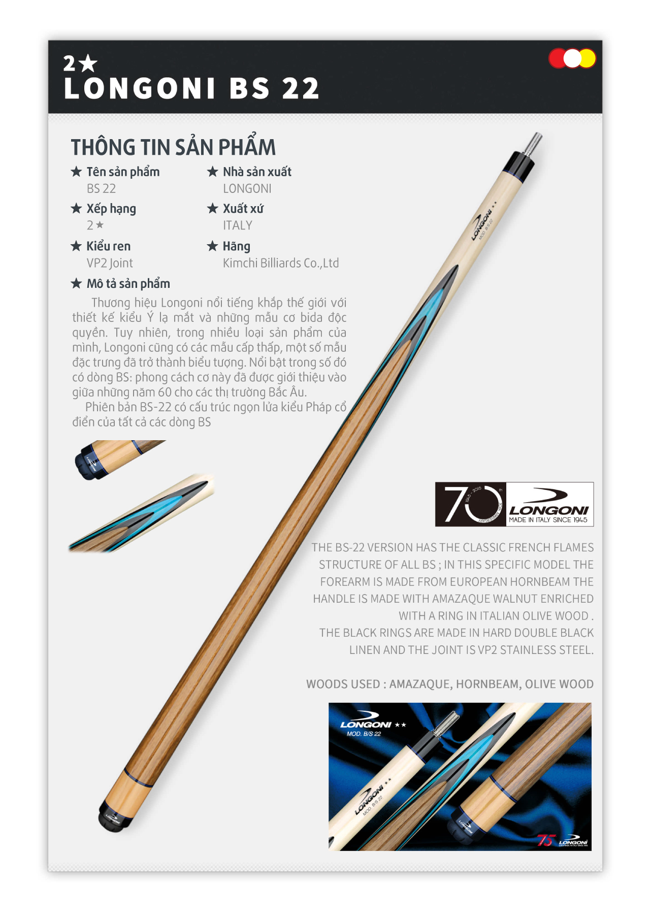 ✪ Mô tả sản phẩm: Thương hiệu Longoni nổi tiếng khắp thế giới với thiết kế kiểu Ý lạ mắt và những mẫu cơ bida độc quyền.